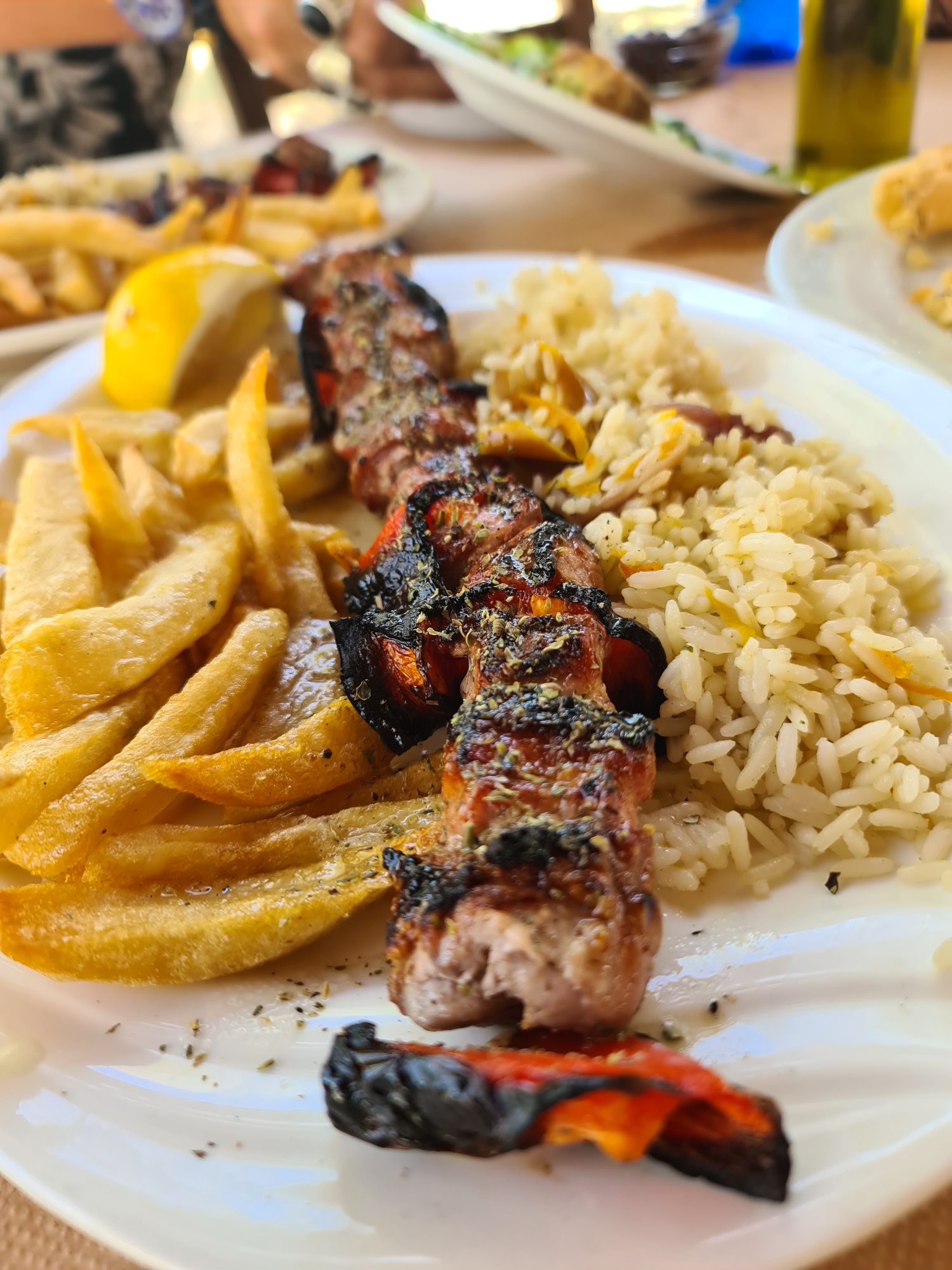 Lamb or pork souvlaki – delicious skewers of cubed meat usually served with rice AND fried potatoes – double carbs right!
